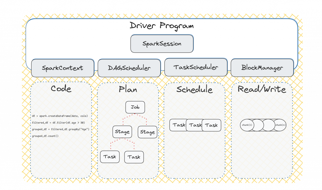 The SparkContext interprets several instructions within the code. After that the DAGScheduler calculates an execution plan. The TaskScheduler schedules Tasks onto available Executors. The BlockManager manages data storage, caching and retrieval between Executor and Driver Program.
