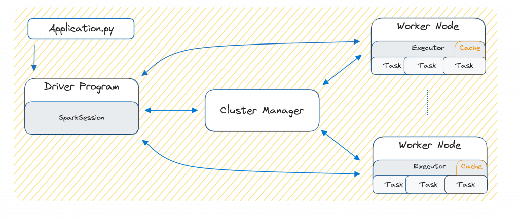 The Driver Program acts as the brain of the cluster. It’s responsible for managing and coordinating the execution of your Application.py. It submits jobs, calculates execution plans, schedules tasks, gathers results and presents these to the user.