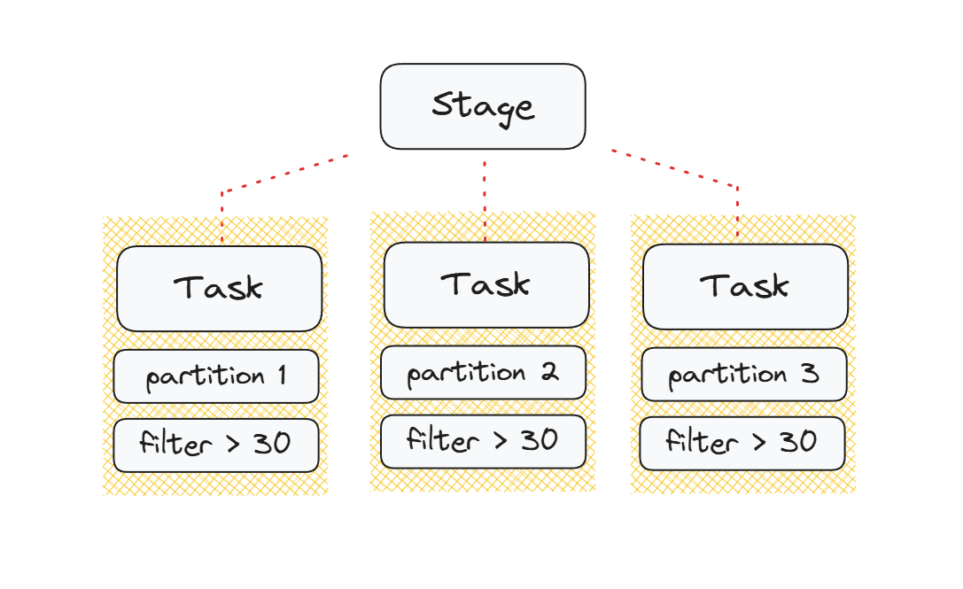 Partition [('Ian', 31, 'M'), ('Jack', 50, 'M'), ('Karen', 27, 'F')]Everything works as expected. Spark splits the RDD into a set of three Partitions. Each partition can now be processed independently, enabling parallel computation and representing Spark’s smallest execution unit — a Task. Let’s put them together and do operations in parallel. The Work is to load and filter data. Sparks defines Tasks, one for each Partition.