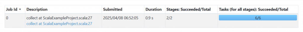 The Jobs: Triggered by our collect() method. Spark gives us information about how many Stages and Tasks were involved and how long the process was.